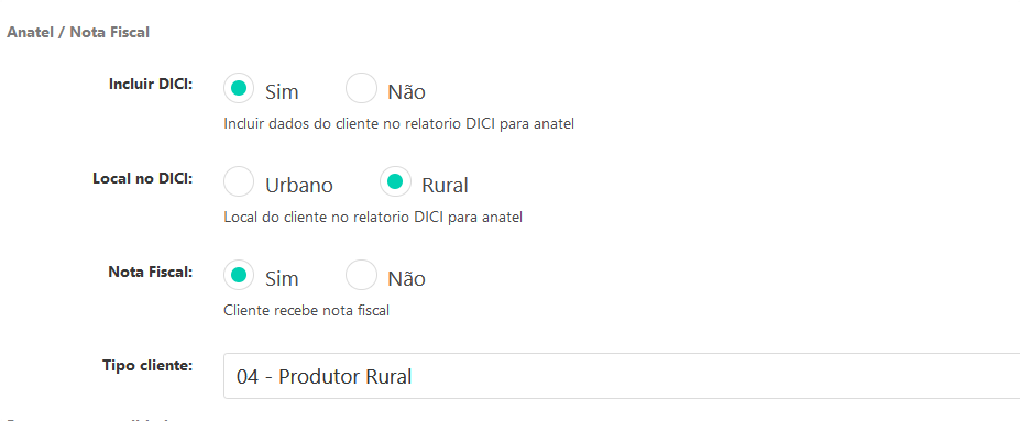 - Na aba financeiro, desça até os campos Anatel / Nota Fiscal.