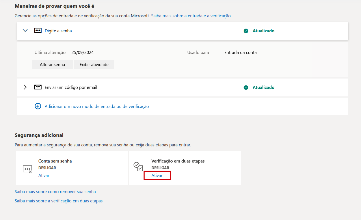 Nessa tela, será necessário ativar a Verificação em duas etapas. Clique em 'Ativar' e escolha a forma de verificação.