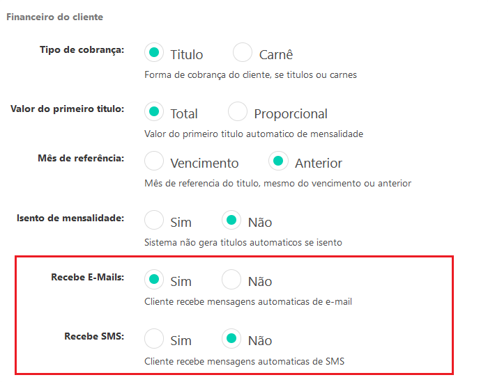 Para que os clientes recebam mensagens, é necessário habilitar a opção “Recebe e-mails” no menu “