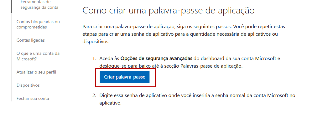Clique no botão 'Criar palavra-passe'. Após isso, faça login com sua conta que será usada para enviar os e-mails.