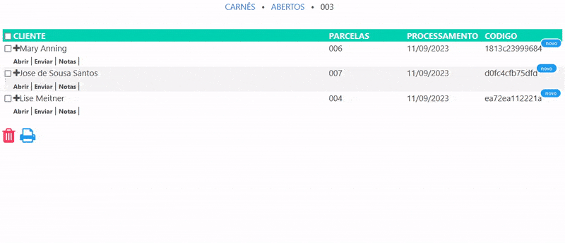 Nesta página, você pode visualizar todos os carnês em aberto. Você pode baixá-los em PDF, imprimi-los ou enviá-los por e-mail.