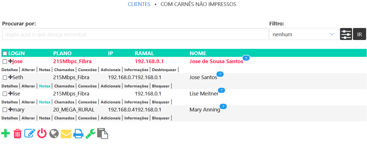 Nesta página, você pode visualizar todos os de clientes com carnês não Impressos“ no MK-Auth é essencial para provedores de internet. Ela mostra quais clientes têm carnês pendentes de impressão, ajudando a gerenciar o fluxo de caixa e lembrar os clientes de pagarem em dia.