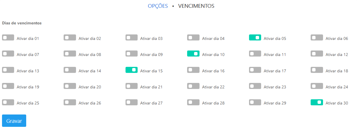 Nesta página, você pode configurar os dias de vencimento para os clientes. É importante considerar o fluxo de recebimento de seus clientes.