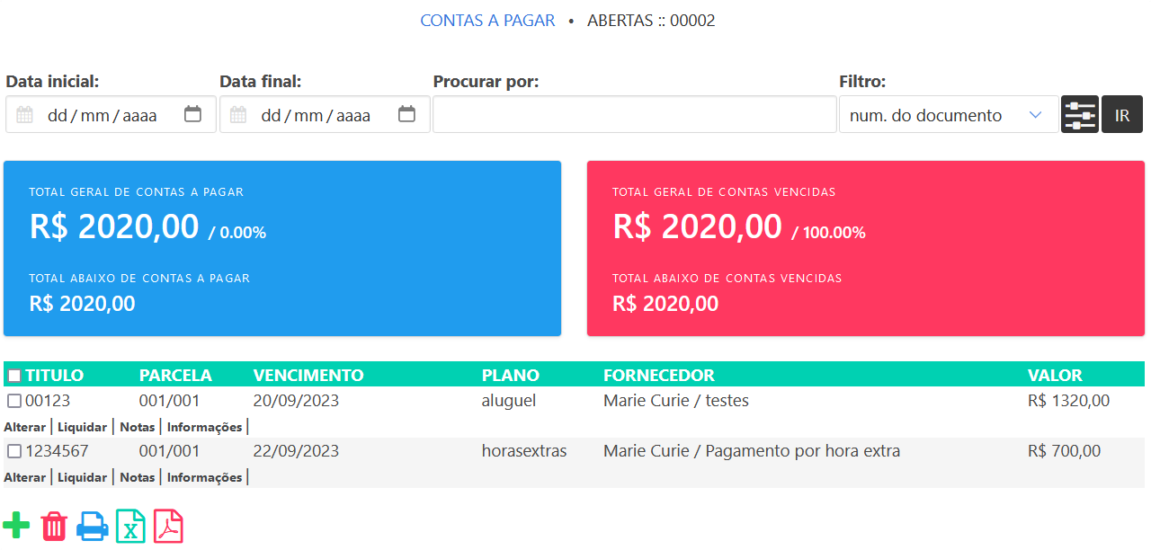 Nesta página, você pode visualizar e gerenciar todas as contas em aberto do sistema, usando as ferramentas a seguir.