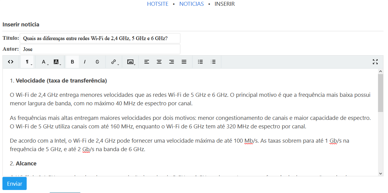 Nesta página, você pode estar inserindo a notícia, fornecendo título, autor e conteúdo.