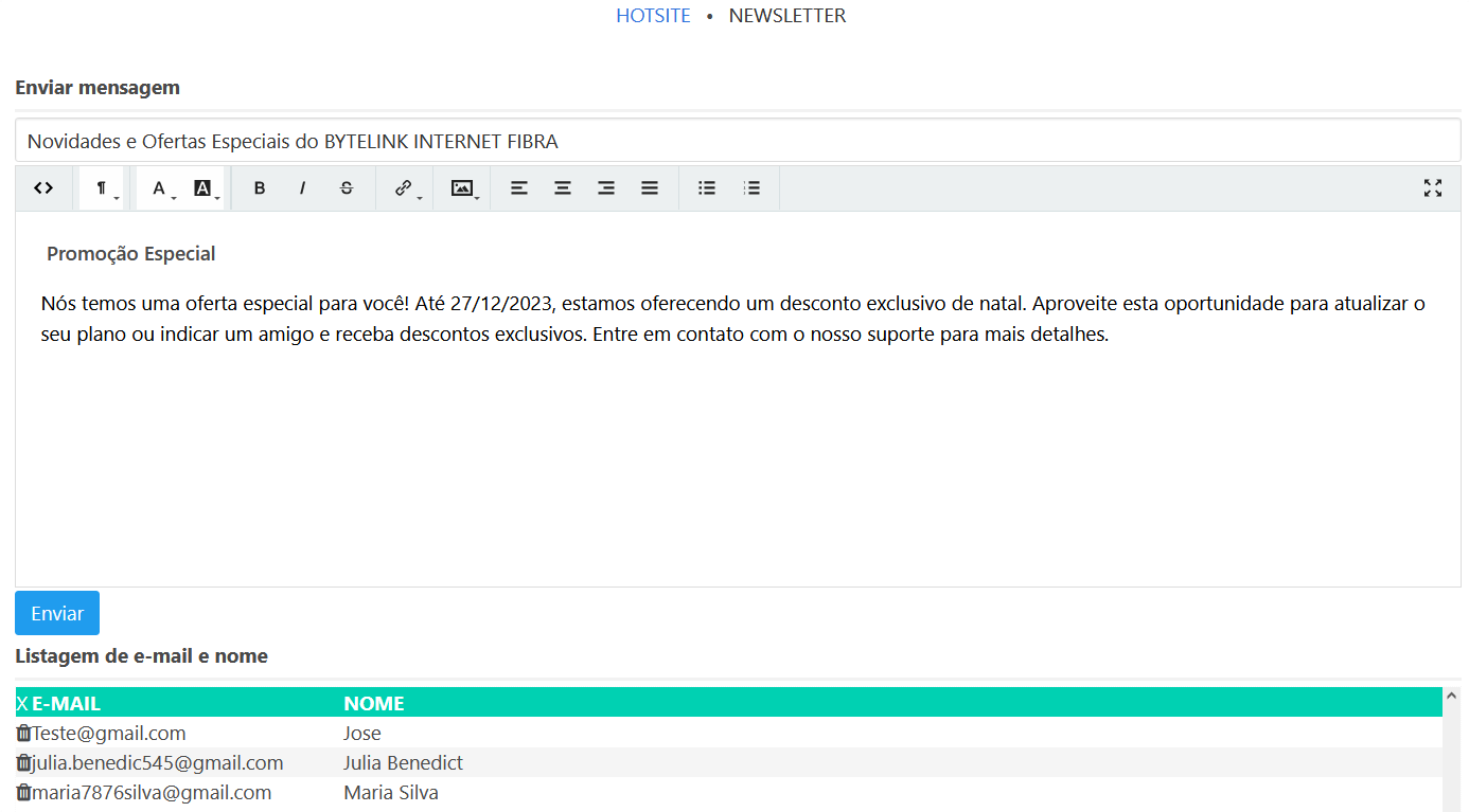 Aqui você pode enviar e-mails para todos os clientes que cadastraram seu e-mail no hotsite na opção NEWSLETTER, você poderá mantê-los informados sobre promoções, notícias e novidades. “Tudo por email”.