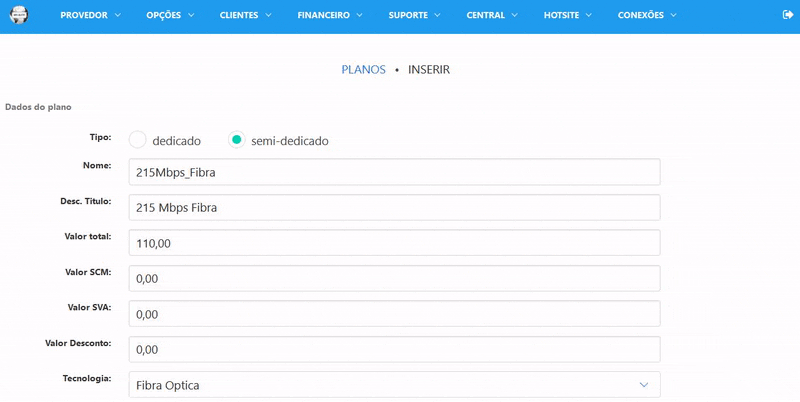 Nesta página você pode criar os planos de acesso de seu provedor, mas lembre-se, evite usar caracteres especiais como: (*)(-)(_)(,) (.), pois pode ser que o servidor Mikrotik não aceite a configuração, podendo deixar seu usuário sem controle de banda ou nem se quer autenticar.