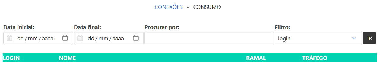 Nesta ferramenta, você pode acompanhar o consumo de internet dos clientes, definindo um intervalo de datas com os campos Data inicial e Data final. Além disso, é possível realizar pesquisas específicas utilizando o campo Procurar por, filtrando por login ou ramal. Isso oferece um controle detalhado sobre o uso da internet por parte dos clientes, permitindo uma gestão eficiente dos recursos da rede.